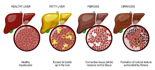 Stage 4: Cirrhosis – the liver shrinks and is permanently damaged from scarring where it may be followed by liver failure and liver cancer