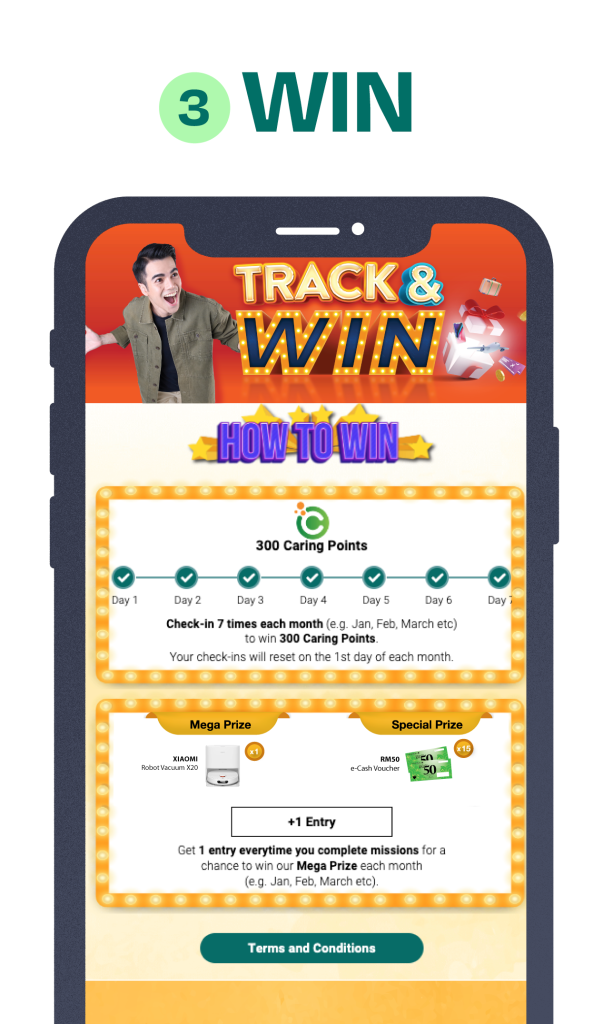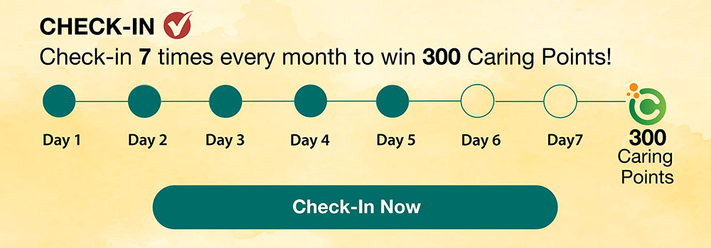 2. First Task: Members are required to check-in 7 times in a month to win 300 Caring Points. The 300 Caring Points will be automatically awarded to the members’ account within minutes. The points will be valid for 1 year from the date of credit.