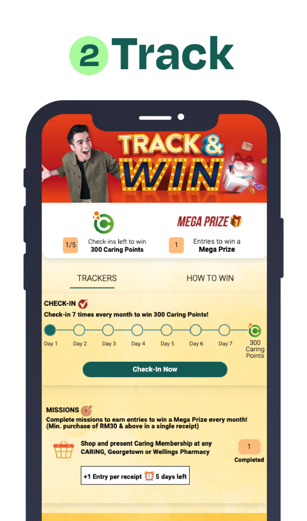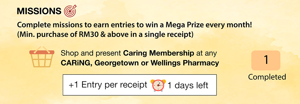 3. Second Task : Members are required to perform sales transactions with a minimum purchase of RM30 and above per receipt at any CARiNG, Georgetown or Wellings Pharmacy physical stores to stand a chance to win a prize.